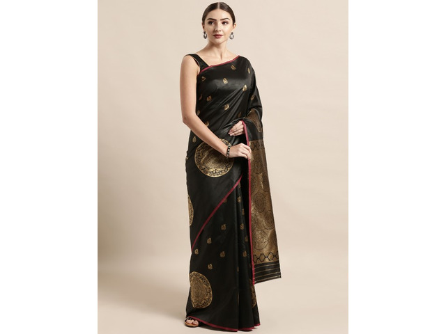 Black and Gold-toned banarasi woven design saree and has a solid border