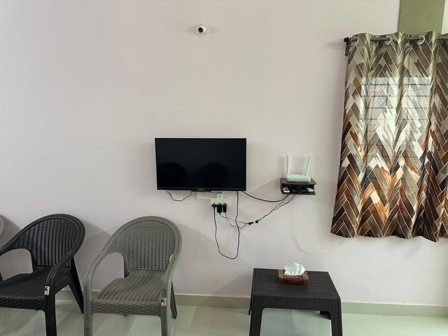 Hall: Relax comfortably with your loved ones, which has a flat screen TV with chairs and coffee table. Spacious enough for all.