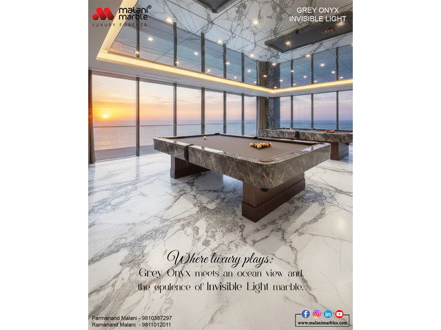 Enhance your interiors with the unique beauty of marble and onyx from Malani Marbles Pvt. Ltd. Our luxury collection includes mesmerizing Italian marble and rare onyx completely from the finest quarries worldwide. Each piece has its unique character, reflected in its veins and colors, ideal for luxury villas, hotels, or high-end designer spaces. Onyx captivates with its translucent beauty, while marble expresses beauty in its age and perfection. As your dependable source for marble and onyx in India, we assure that each stone fulfills the finest quality and finish. Visit us to experience the ultimate blend of nature's craftsmanship and man's artistry.