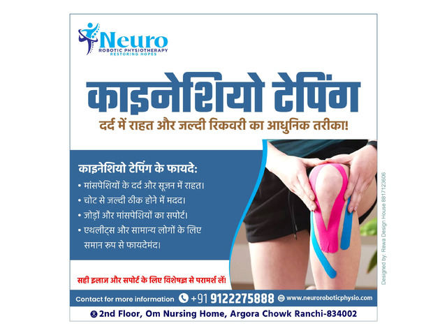 Are you struggling with muscle pain, swelling, or injury recovery? Neuro Robotic Physiotherapy offers Kinesio Taping Therapy — a modern and effective approach to alleviate pain and speed up recovery.
